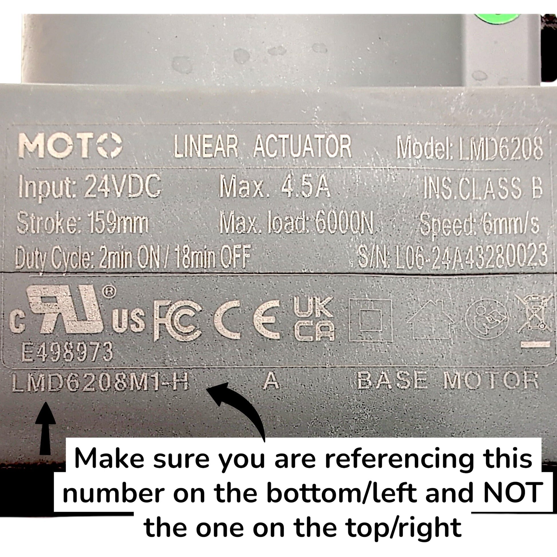 Another thing that makes these actuators with the same reference model number distinct from each other is the connector type and color. So, always check these 3 things when ordering. The connector Color, Connector Type, and that Model number found on the bottom left of the product label.